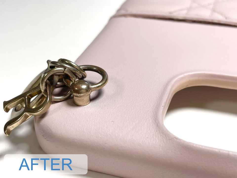 そこで今回は、クレンジングで汚れを落とした後、樹脂が見えてしまっている箇所に丁寧な下地処理を施し、全体を同色塗装することで、ディオールらしい気品ある姿へと復元させました。